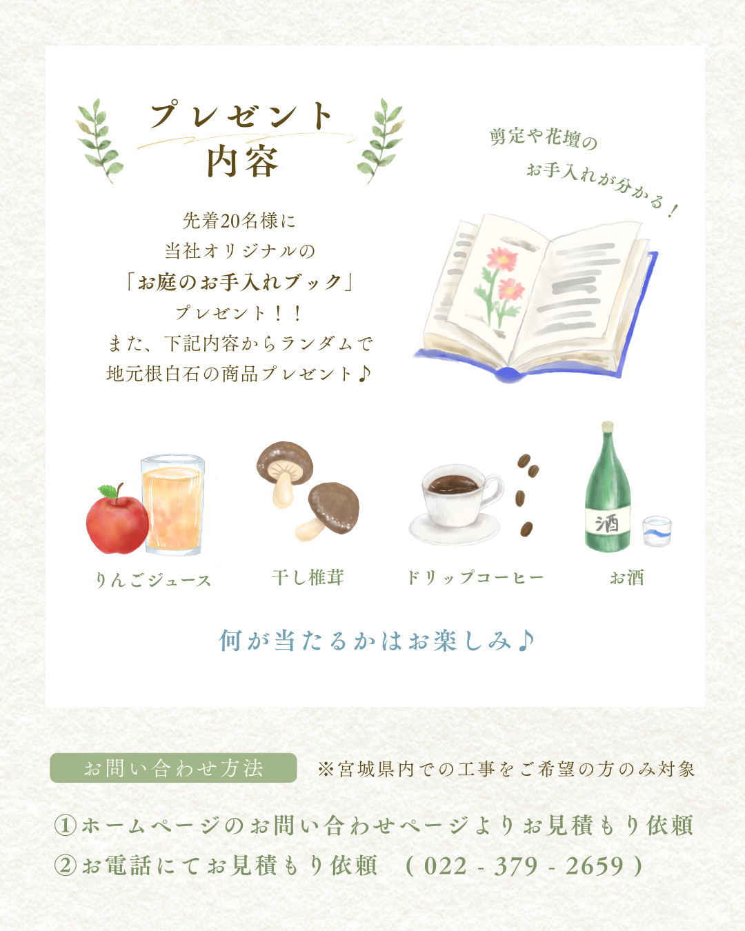12/20㈮~1/31㈮までの間に、お庭や外構のお見積りをご依頼頂いた方の中から抽選で、弊社の地元・根白石で生産された農作物やお酒、冬から春に咲く花苗をプレゼント♪