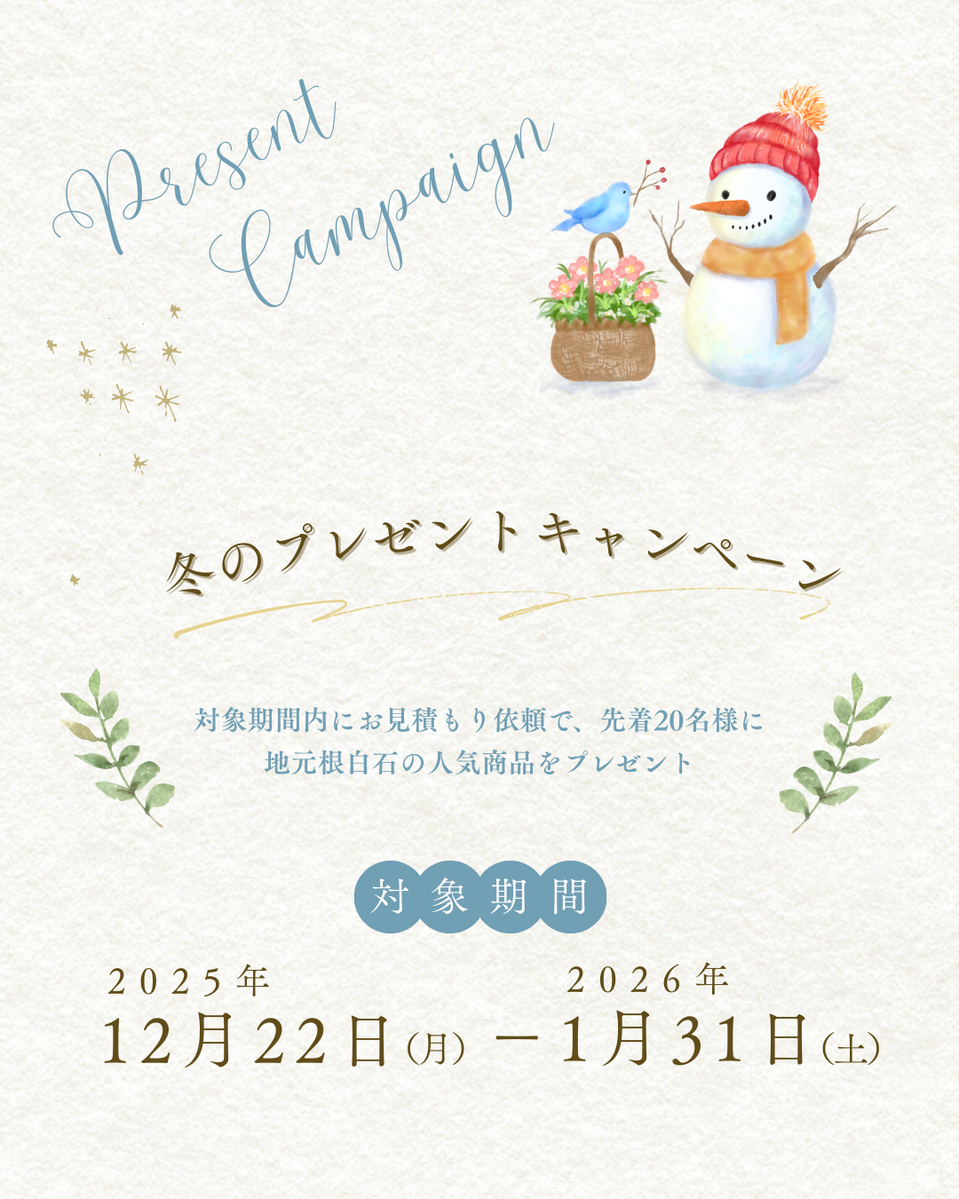 12/22㈪~1/31㈯までの間に、お庭や外構のお見積りをご依頼頂いた方の中から先着20名様に、弊社の地元・根白石で販売されている人気商品をプレゼント♪