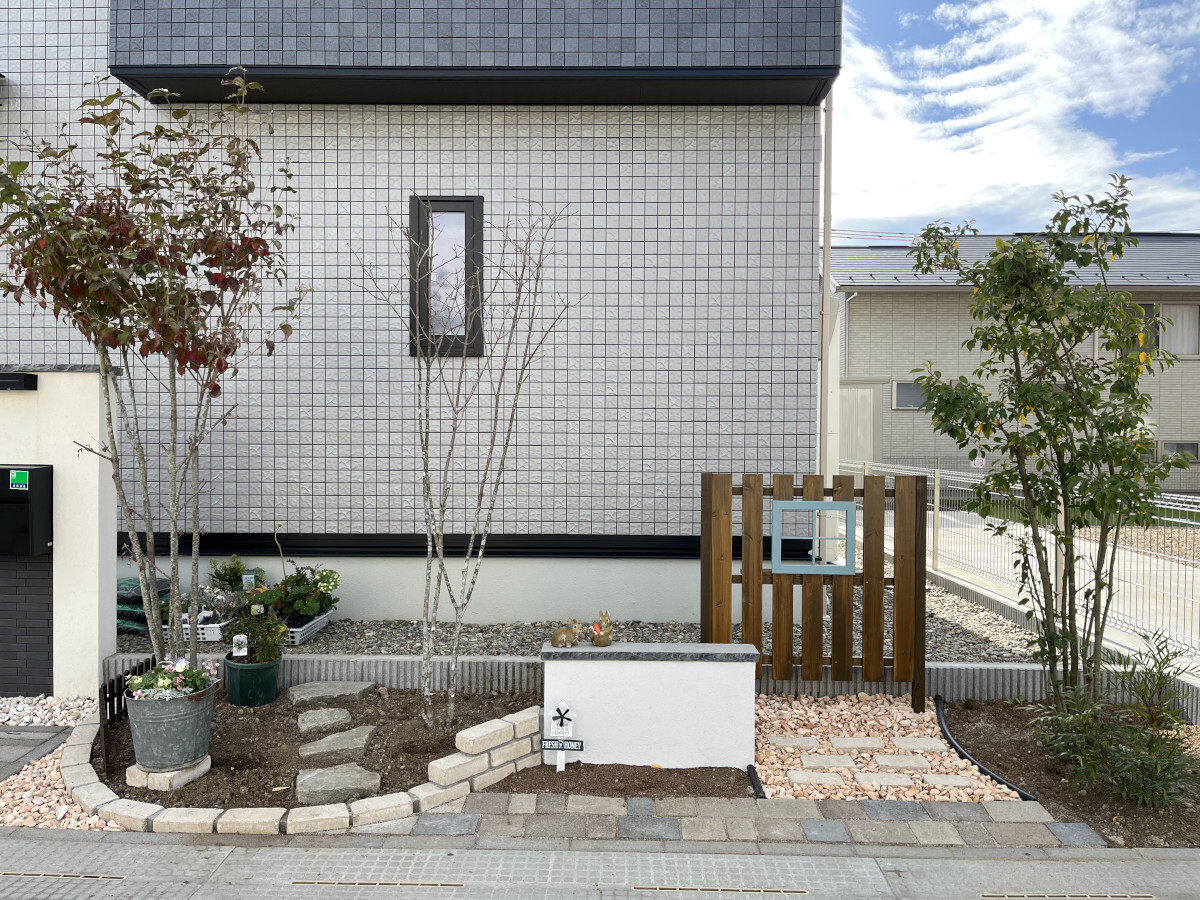 オリジナルピックや木製フェンス、レンガチップ等もアクセントになり、大人可愛い花壇となりました。植栽はご家族で植える事になったので、納品のみでご対応させていただきました。