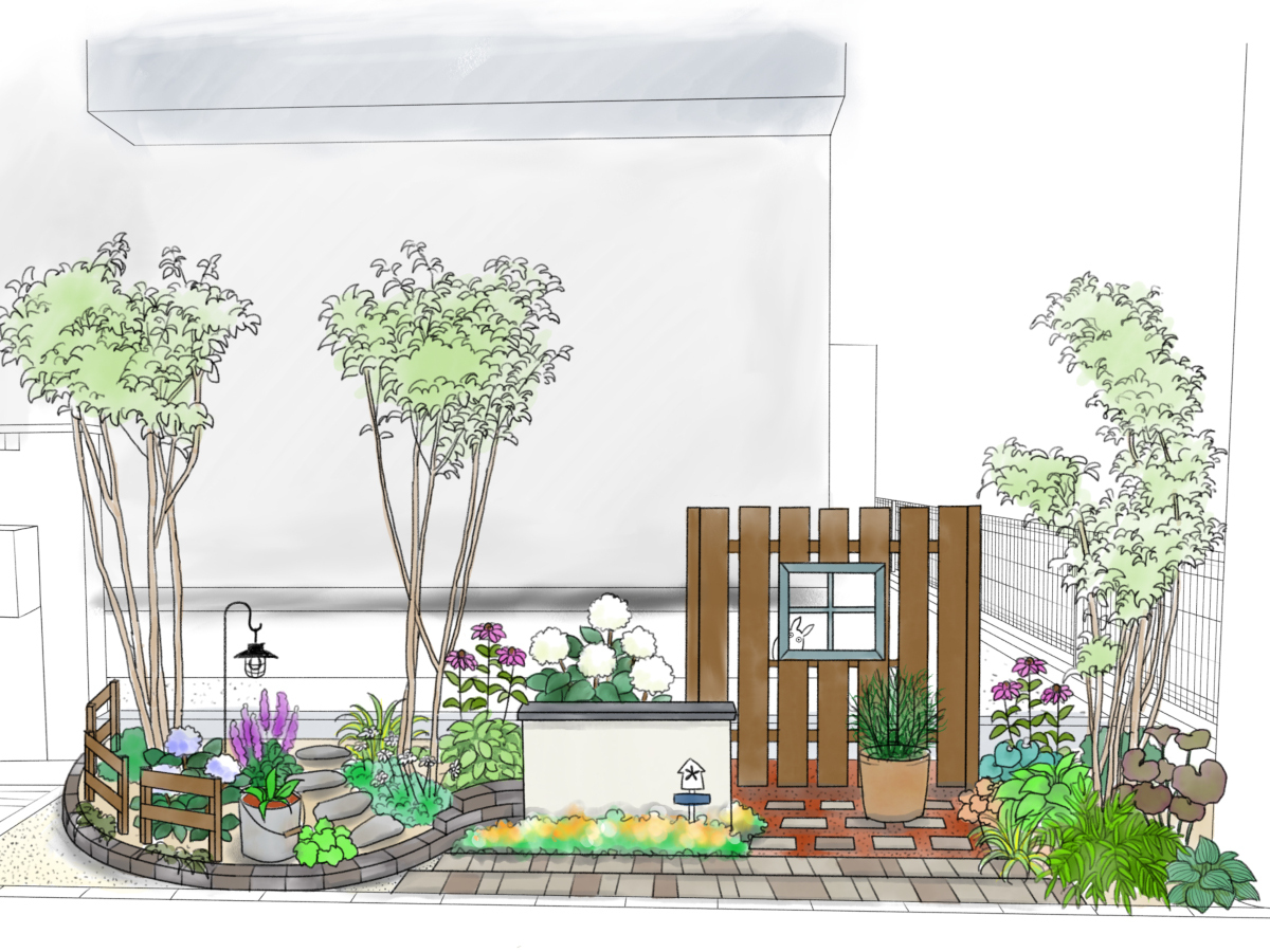 お客様のご希望は、可愛らしく明るい空間となるような花壇にして欲しいとの事でした。また、お話しを伺う中で、となりのトトロがお好きとの事でしたので、トトロが出てくるような森をイメージして、植栽はカラーリーフや花色の落ち着いた物をメインに、ナチュラルな雰囲気になるようご提案しました。