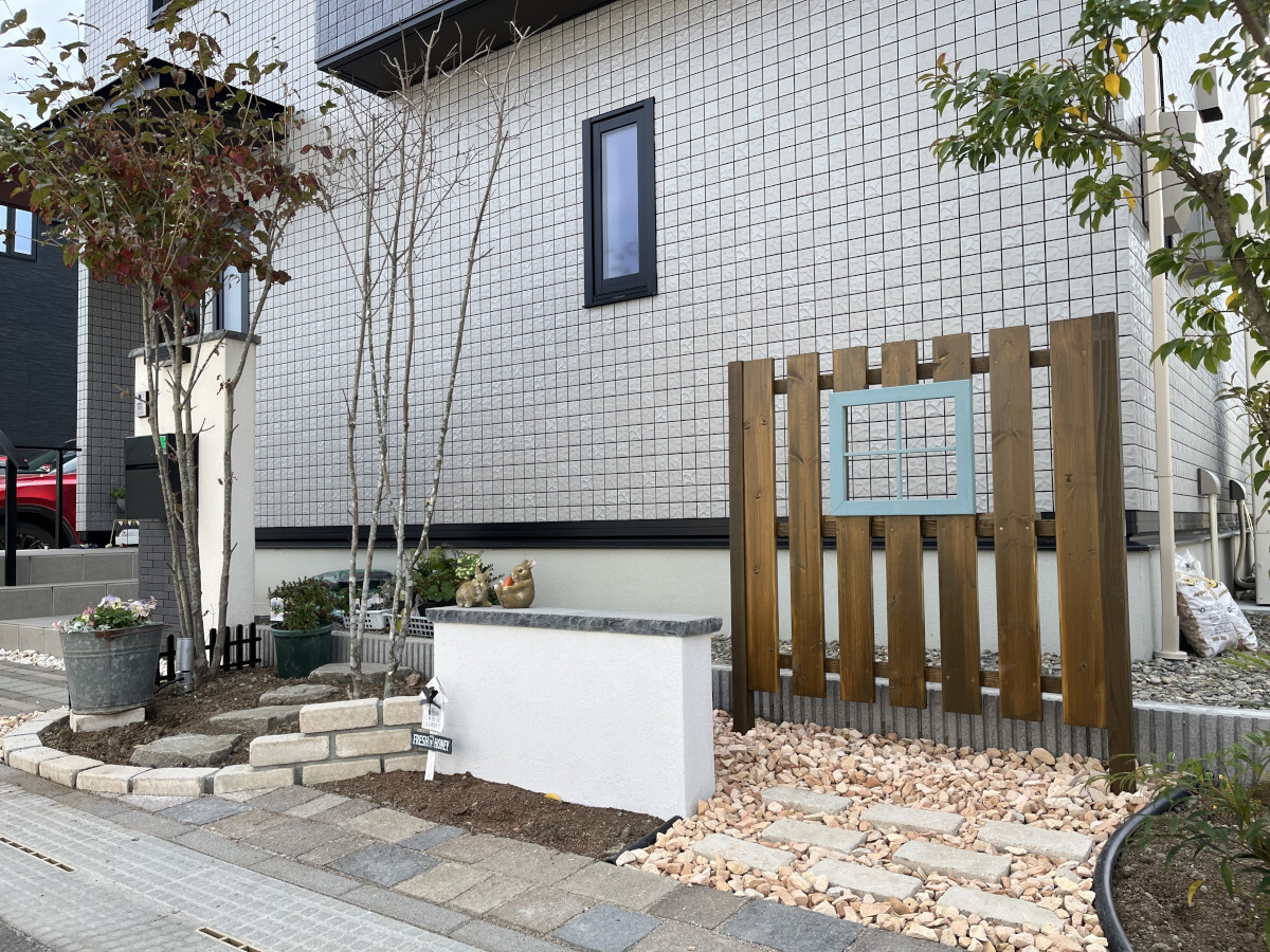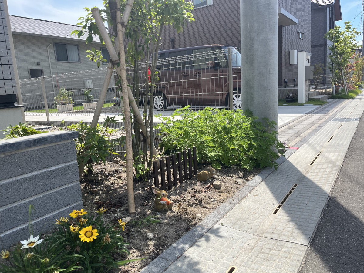玄関先の植栽帯を可愛らしくしたい。初めてお伺いした際、花壇の植物はお家を購入した際にハウスメーカーで植えられた物のまま、どちらかと言えば和モダンよりで、お客様の理想とするイメージとは違う物でした。