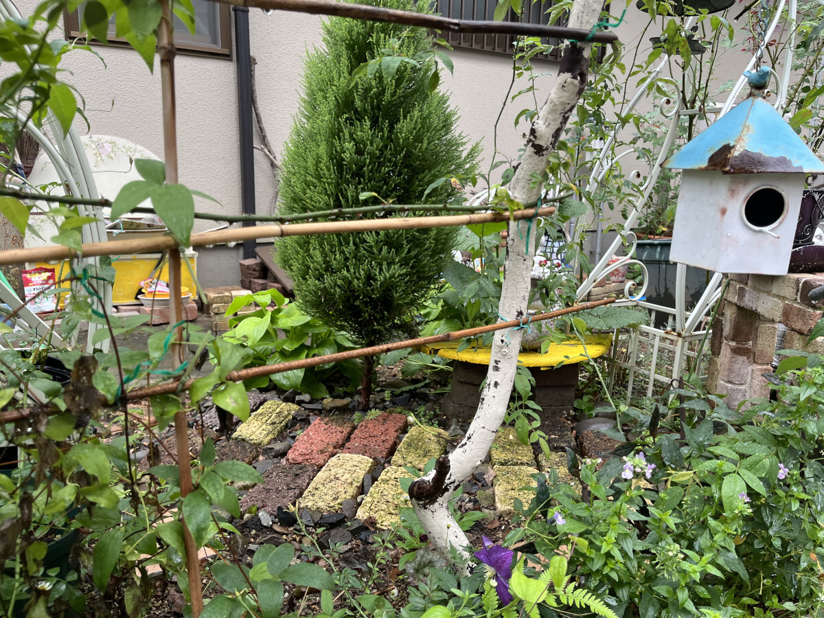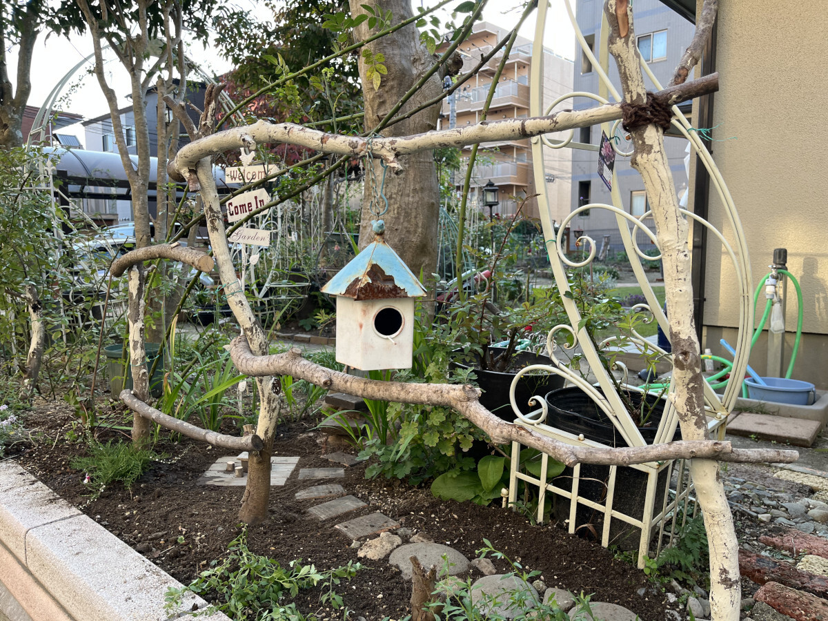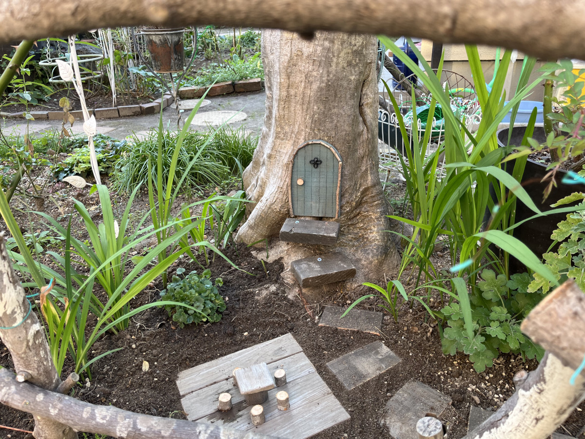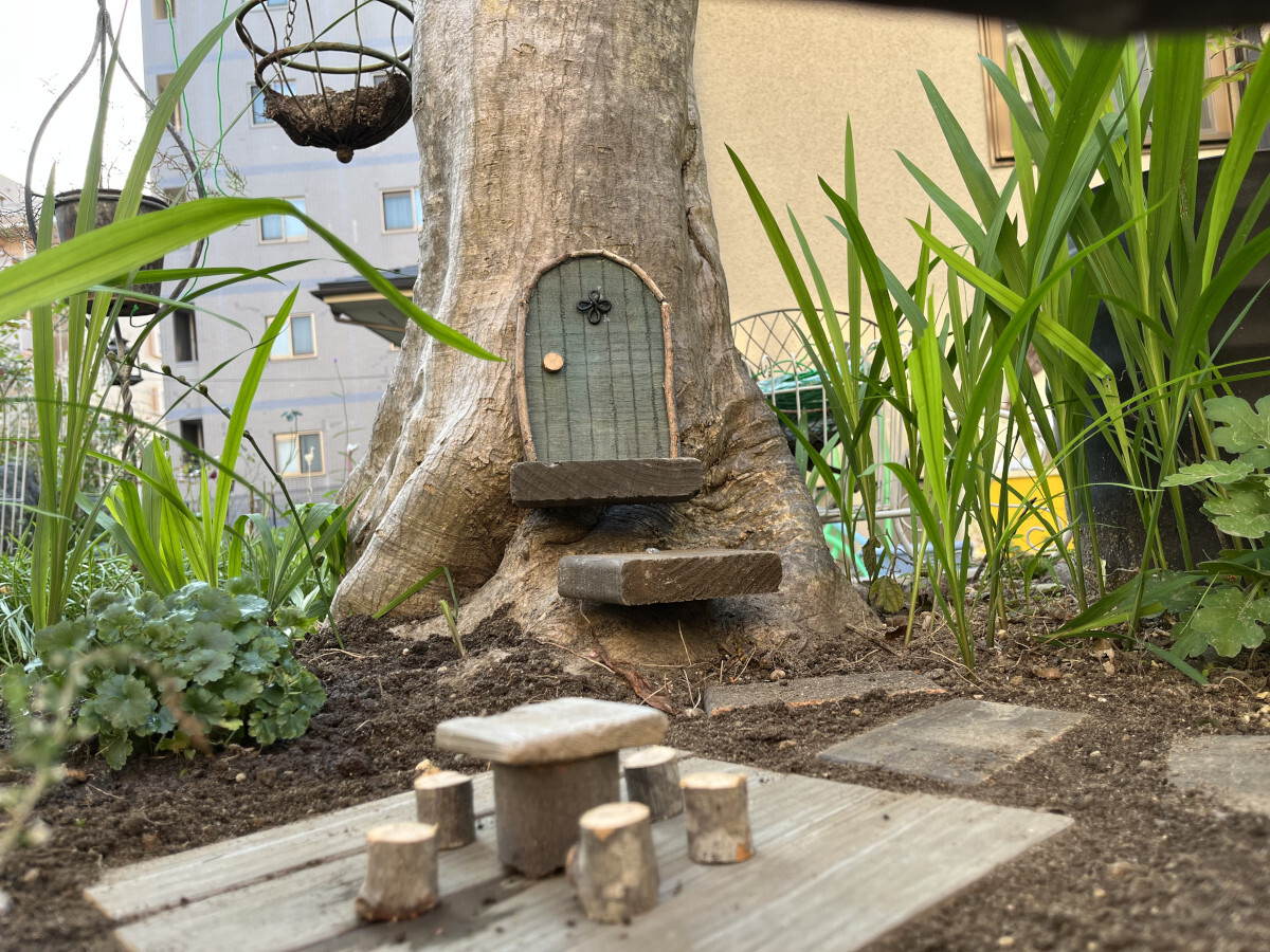 雑貨や素材はもともとお客様が持っている物を使い、木製フェンスや門扉、レンガの一部のみ新規で設置しました。施工はお客様と設計者が一緒に行い、雰囲気や見た目、配置などを細かく相談しながら作り上げました。また、大きな幹があったので、妖精の扉を設置したり、木の枝を利用して窓枠風の柵を設置するなど、細かい工夫も多く盛り込みました。