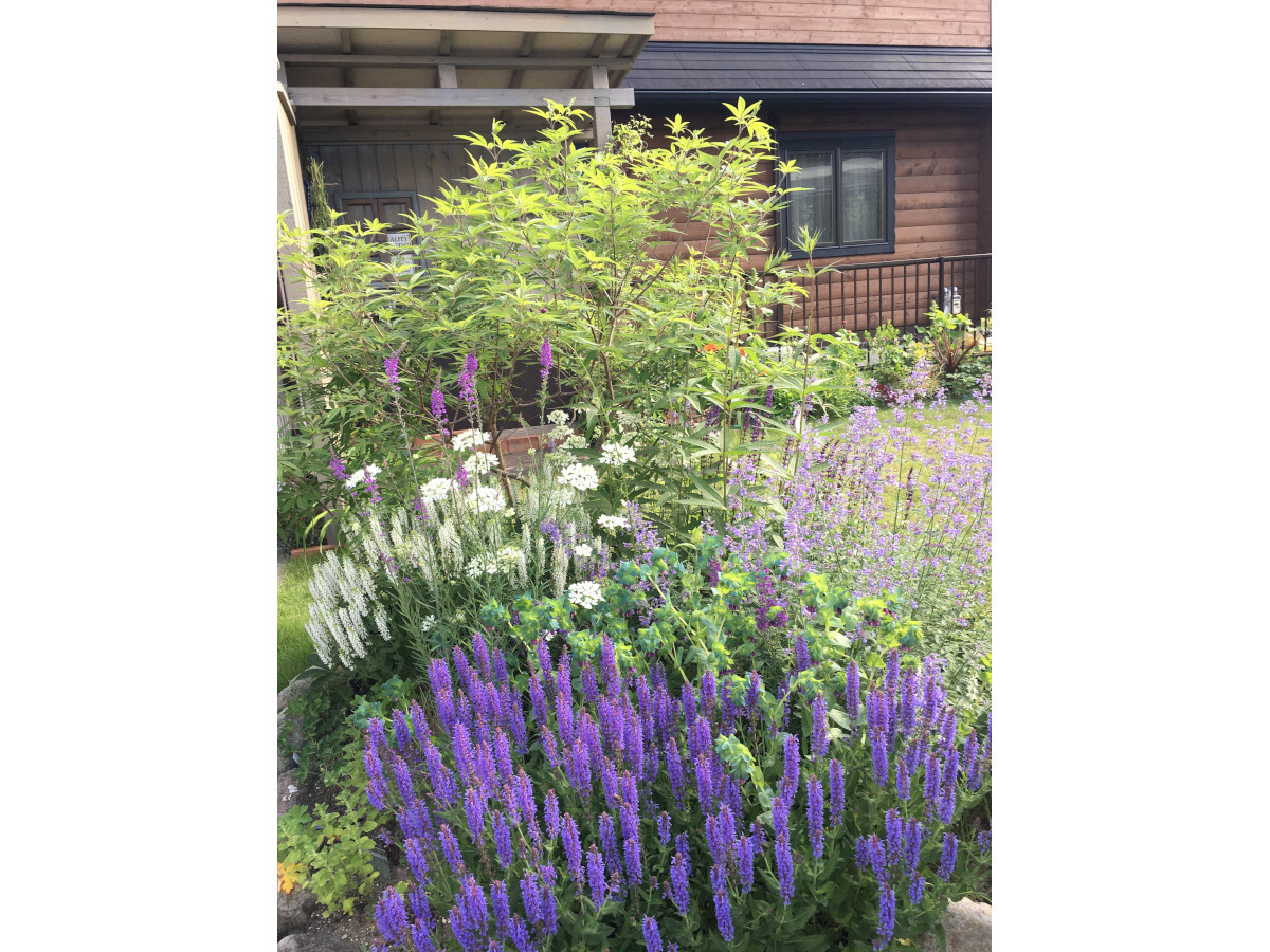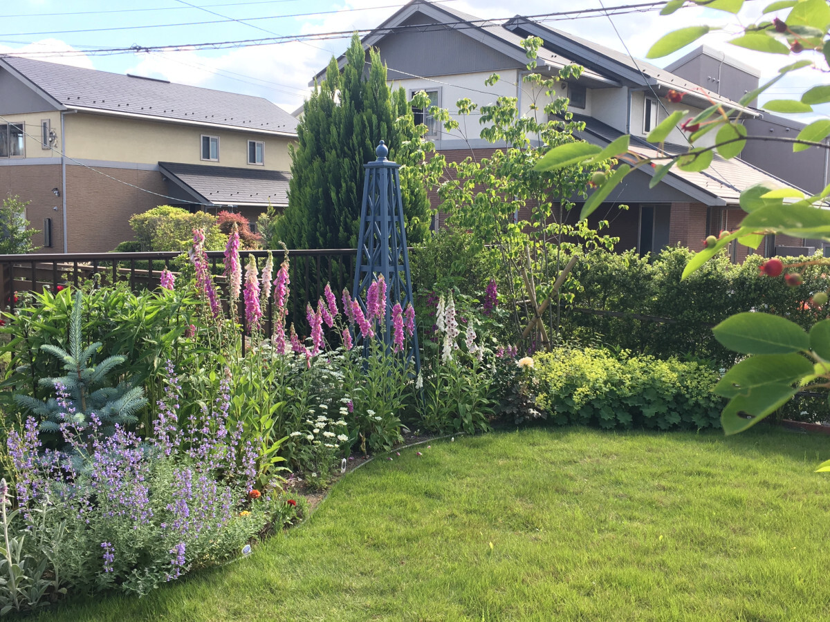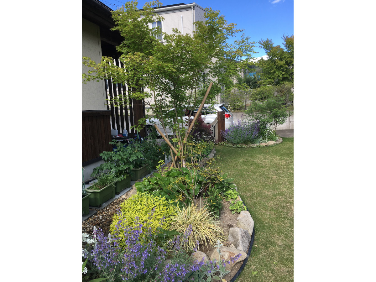 草花の植え込みは奥様ご自身が。エリアごとに色を決め、隣り合う植物もいろいろなガーデンの画像を参考にしながら選びました。一年後、きらめくガーデンへと成長しました。